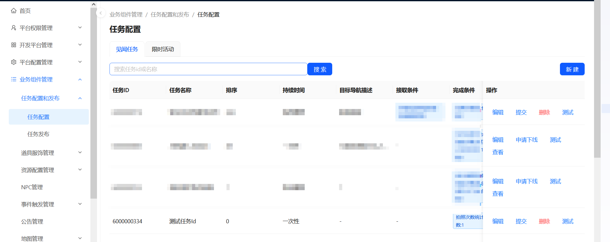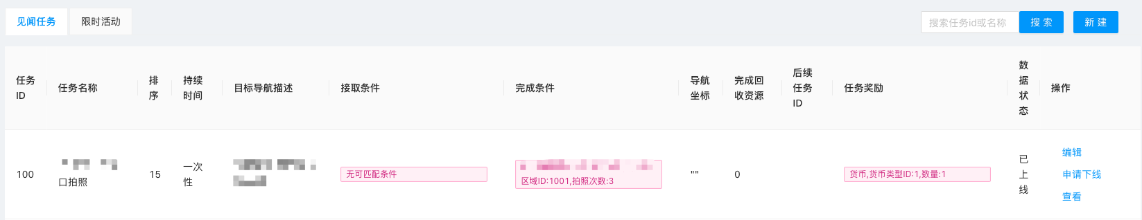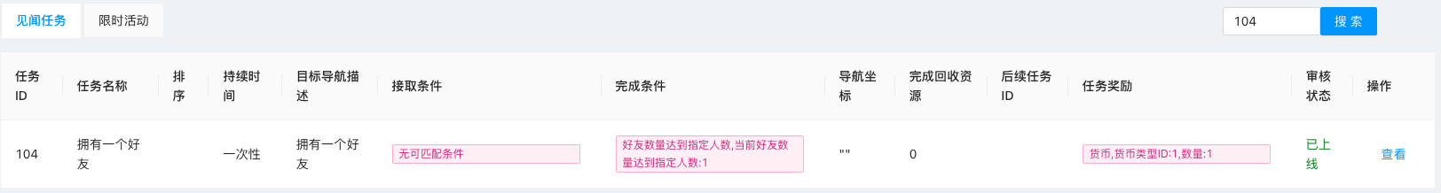 搜索成功后,以列表展示任务ID、任务名称、排序、持续时间、完成条件、审核状态等任务信息