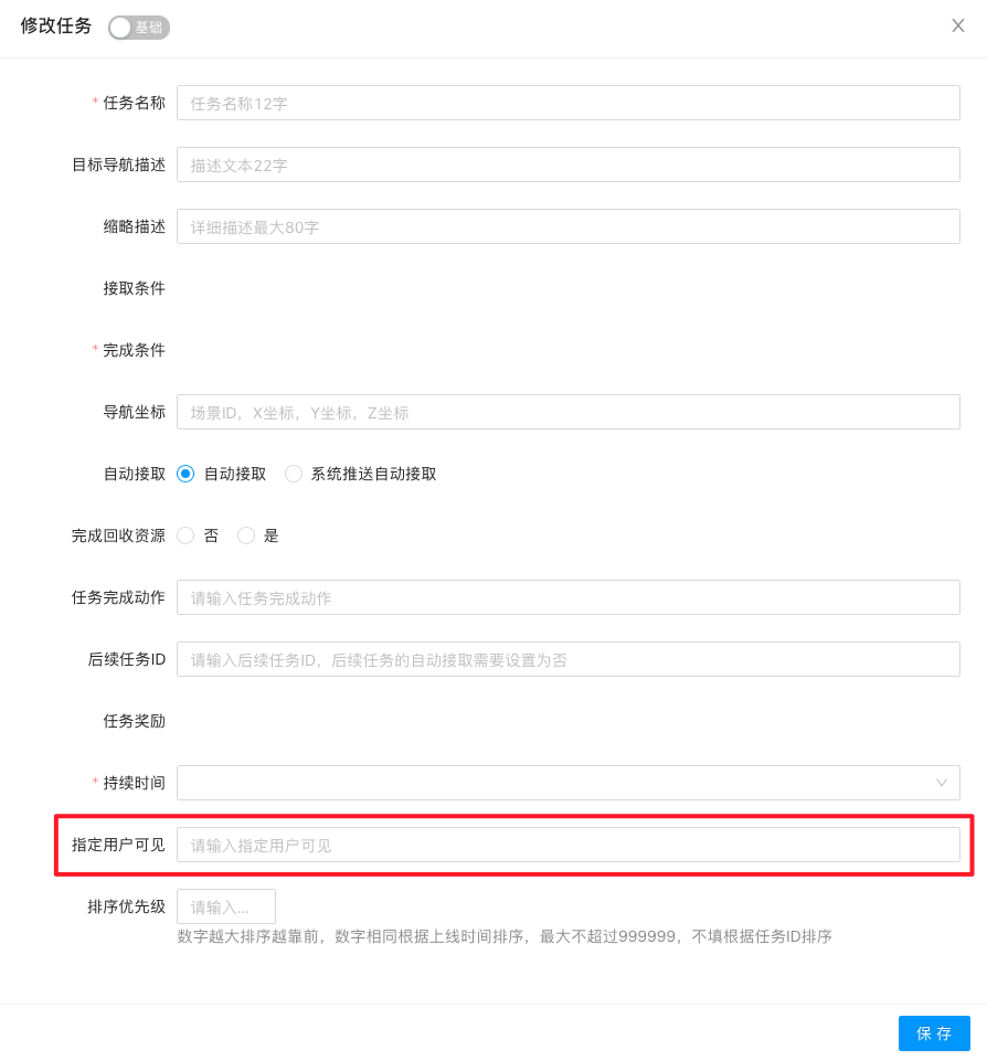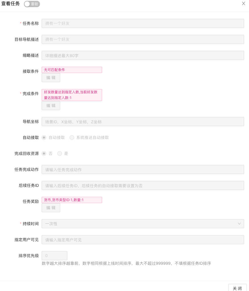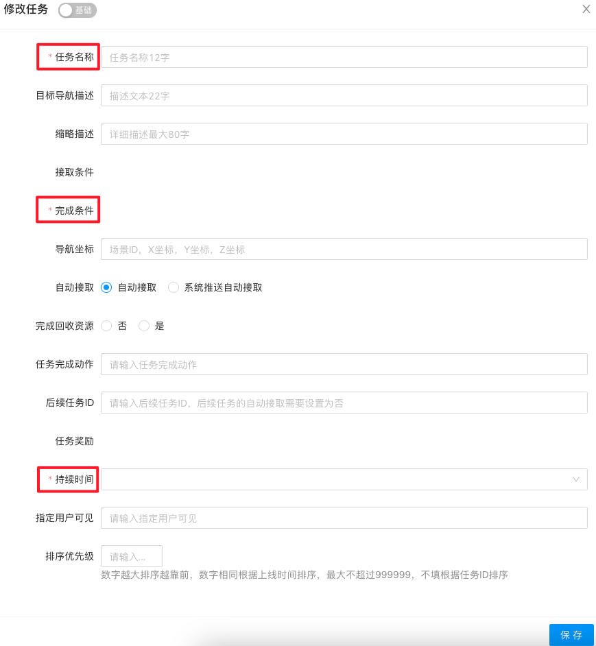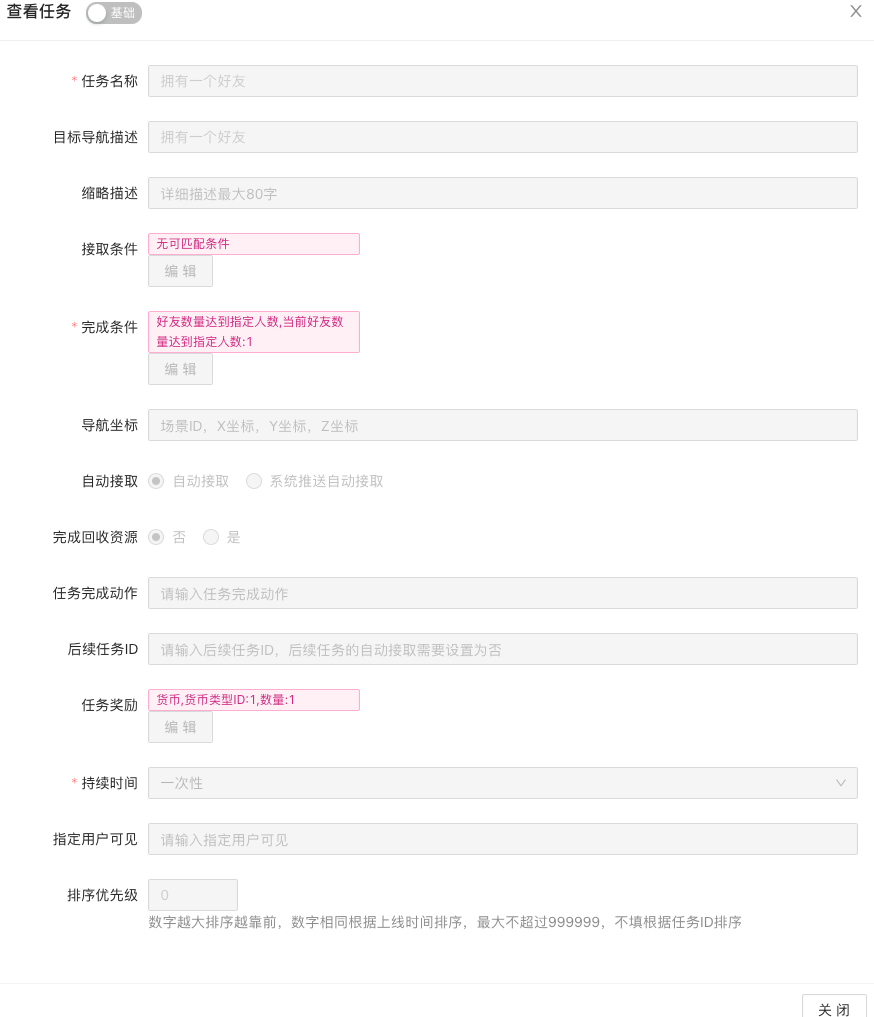 点击“新建”按钮,填写任务名称、内容、判定条件、发放的奖励、持续时间、频率等参数,设置新增任务的内容