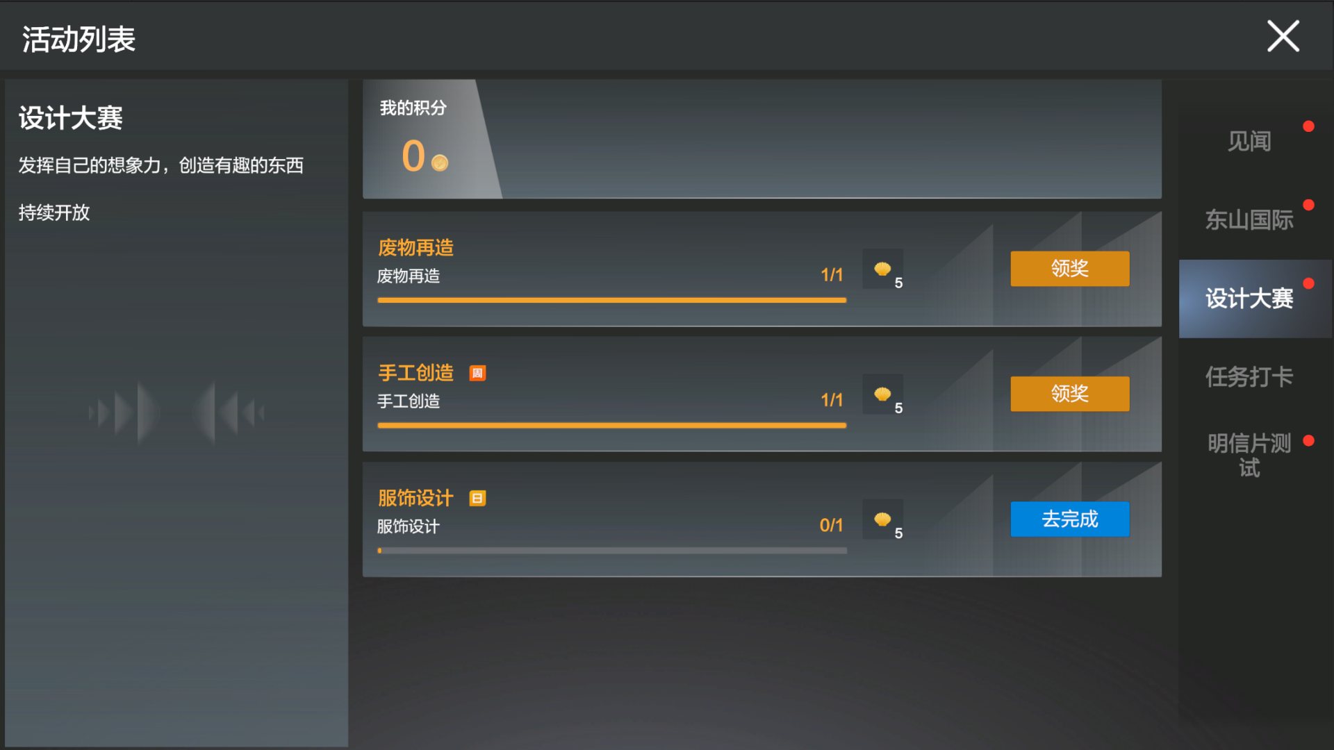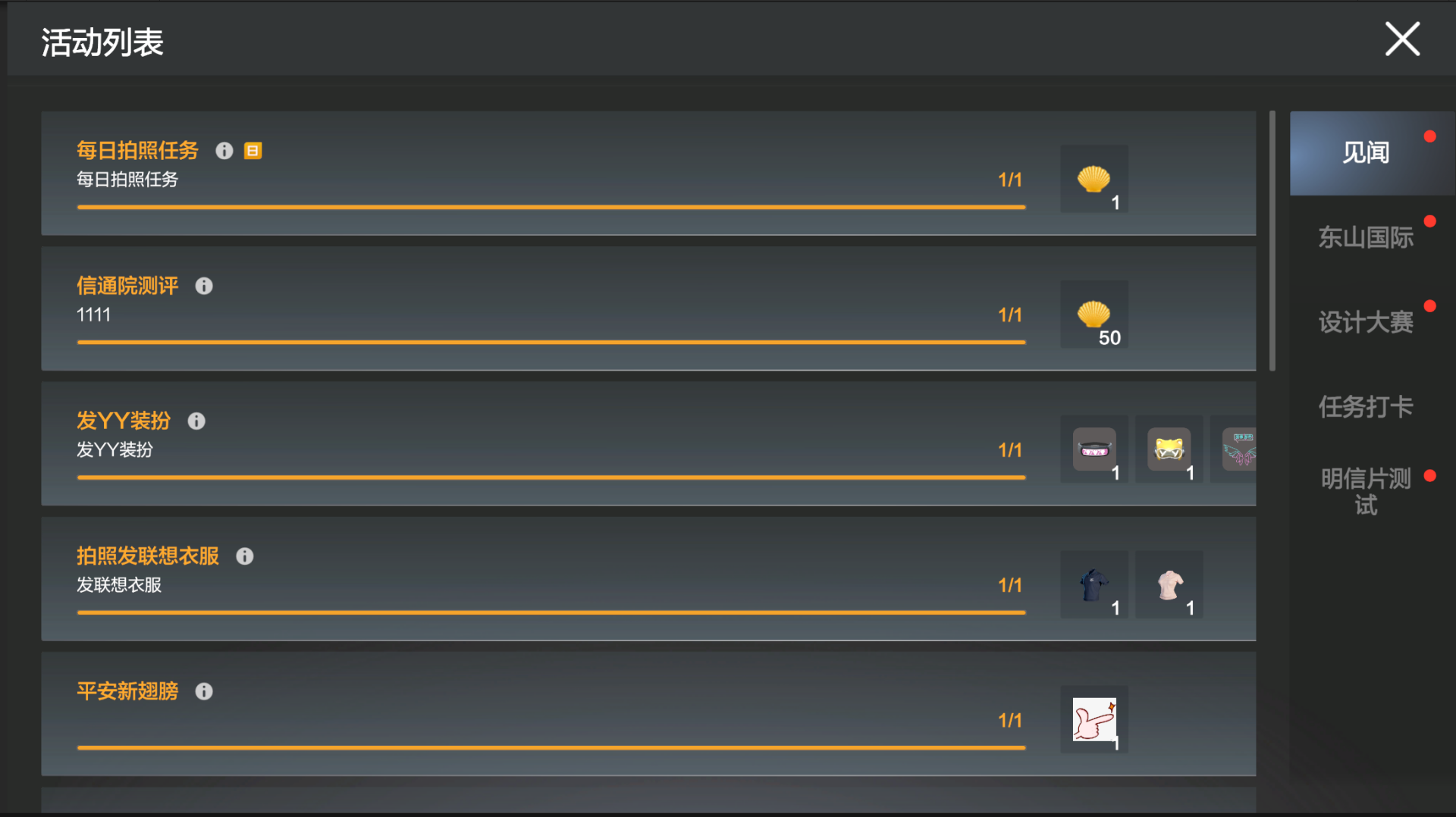 提供「见闻任务」和「限时活动」两种任务类型,通过页面上方Tab进行切换。
