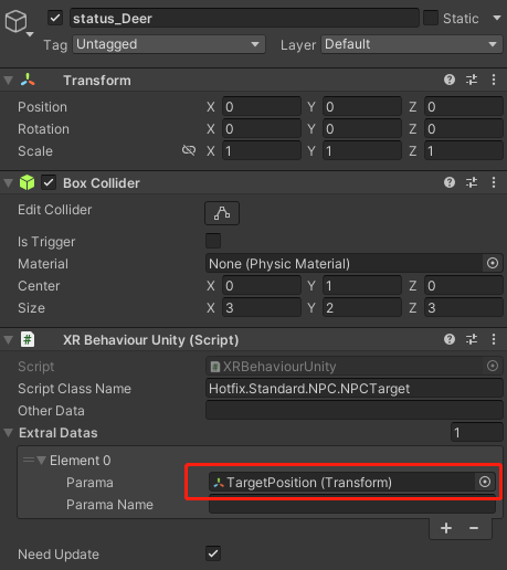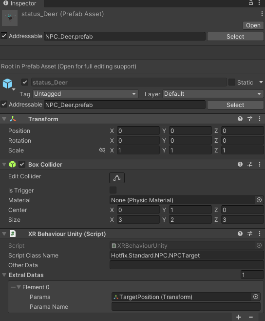 1.1 创建预制体 预制空Prefab,预制体属性增加Box Collider,用于触发Npc铭牌,添加脚本XR behaviourUnity中的Hotfix.Standard.NPC.NPCTarget 。