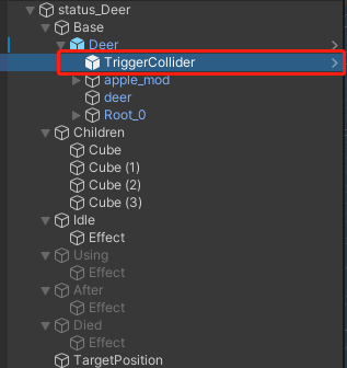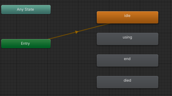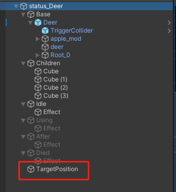 2.2 掉落部件 创建一个属性为空的对象命名为Children作为掉落物集。 Children内每个对象在完成一次采集后,就会隐藏一个,按需求数量配置。 2.3 NpcAnimator制作 在Npc主体上配置对应的状态机 状态必须一对应: idel-待机 using-采集中状态 end-采集后状态 died-采集死亡状态(死亡功能尚未开发)