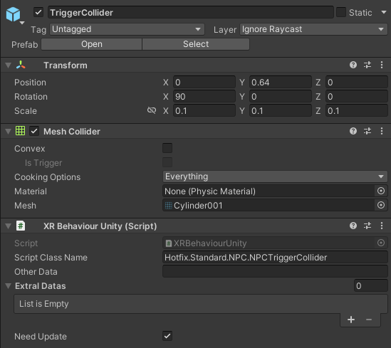 预制体内部增加项目原有的TriggerCollider Prefabs,用于控制玩家与Npc的交互范围