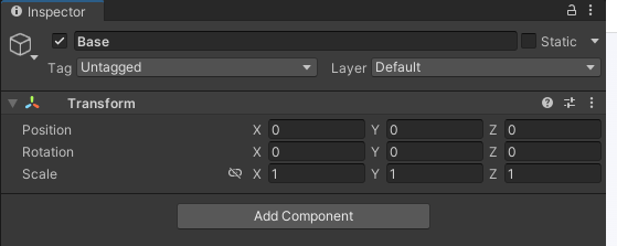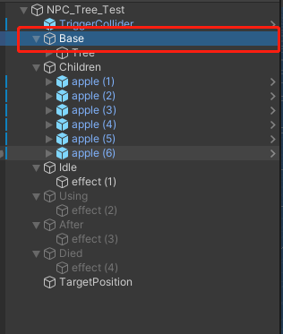 主体Prefbs:采集Npc分为主体部件,和掉落部件。主体部件为采集交互Npc本体(必须配置),掉落部件为完成一次Npc采集行为后销毁的对象,可配置多个或者不配。 2.1 主体部件 创建一个属性为空的命名为Base的对象,内部用放置采集Npc主体。