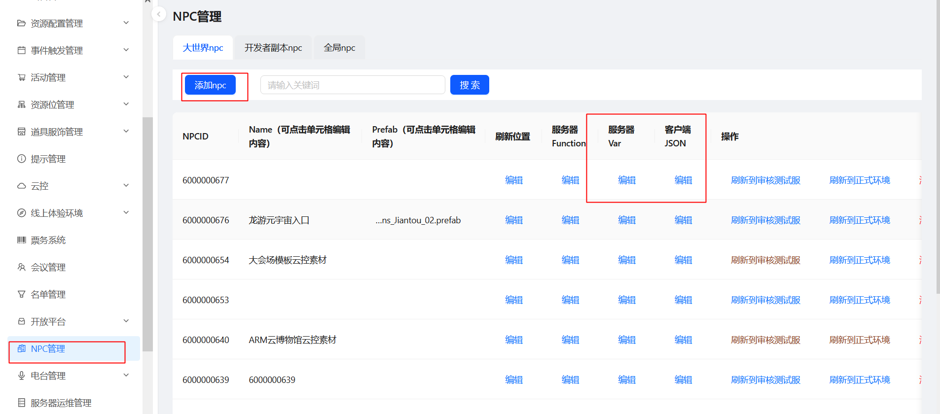 }5、在运营后台配置NPC的预制体(主工程注册在Addressables的NPC可以用在任意位置,如果是副本工程Addressables注册的NPC只能用在当前副本,其他副本取不到该NPC的资源) 6、在运营后台配置NPC的刷新位置 7、任务即可与该NPC进行点击交互